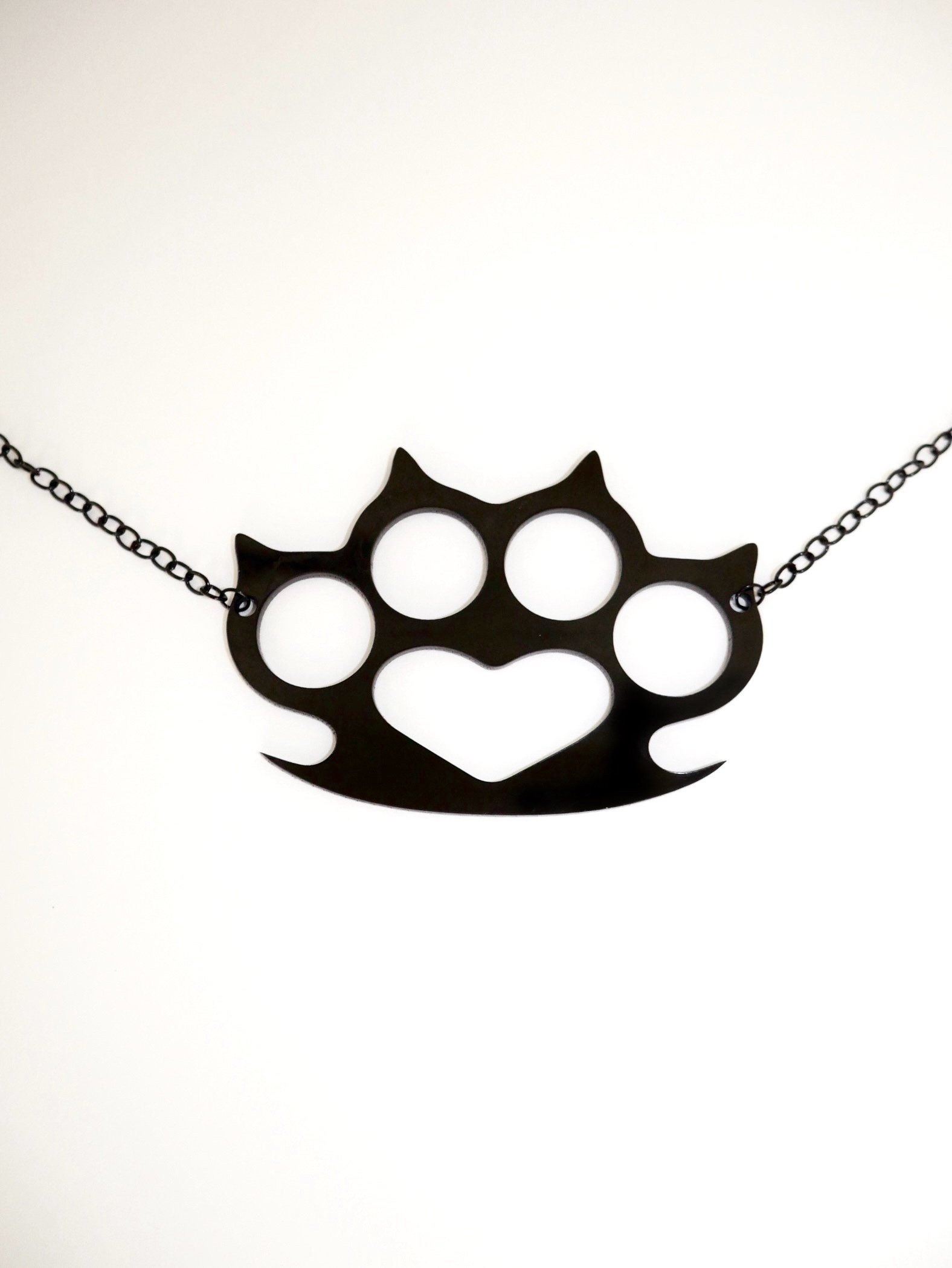 Spiky brass knuckles necklace with heart shape cut out sits right in the center of your chest for everyday wear. Double sided solid black gloss. Scene and crunk kid staple. Put your paws up!