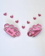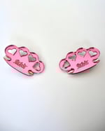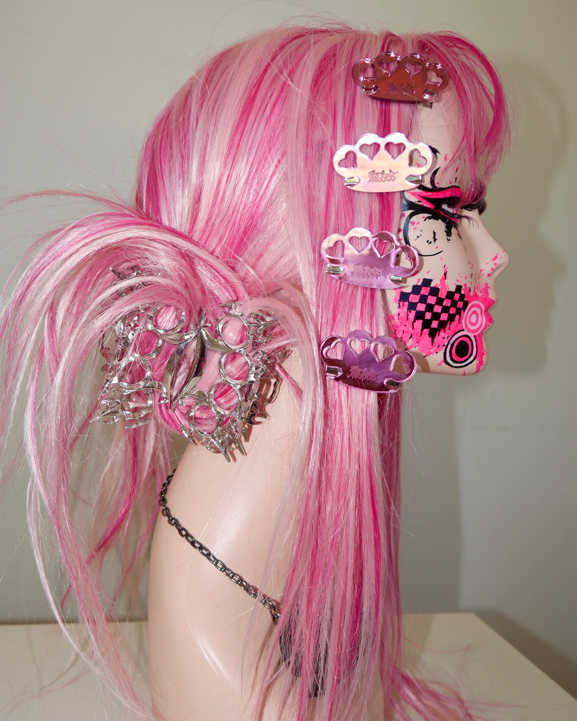 Pink reflection brass knuckles hair clip with heart cut outs and taboo signature engraving