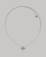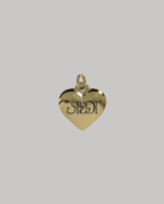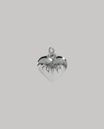 High-shine, chrome-plated, cast brass heart pendant with laser engraved JIUDI logo and SANDY TABOO logo collaboration detail on a stainless steel square chain with silver JIUDI logo tag.